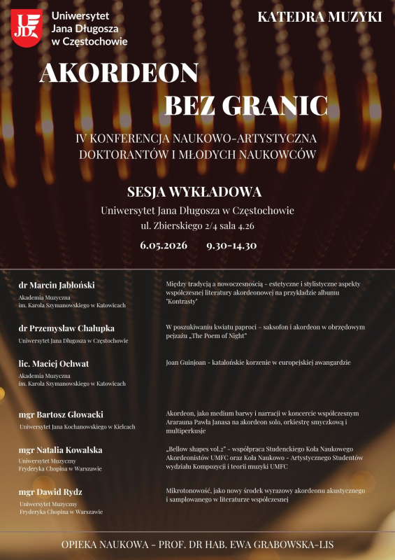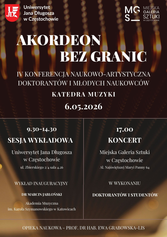 Katedra Muzyki zaprasza na IV Konferencję Naukowo – Artystyczną Doktorantów i Młodych Naukowców „Akordeon bez granic”, która odbędzie się 06.05.2026 r. w godz. 9:30–14:30 w sali 4.26 w budynku przy ul. Zbierskiego 2/4. Wyniki swoich badań naukowych i artystycznych będą prezentować studenci polskich szkół doktorskich m.in. z Uniwersytetu Muzycznego Fryderyka Chopina w Warszawie, Uniwersytetu Świętokrzyskiego w Kielcach, Uniwersytetu Jana Długosza w Częstochowie oraz młodzi naukowcy z Akademii Muzycznej im. Karola Szymanowskiego w Katowicach i Akademii Muzycznej im. Stanisława Moniuszki w Gdańsku.